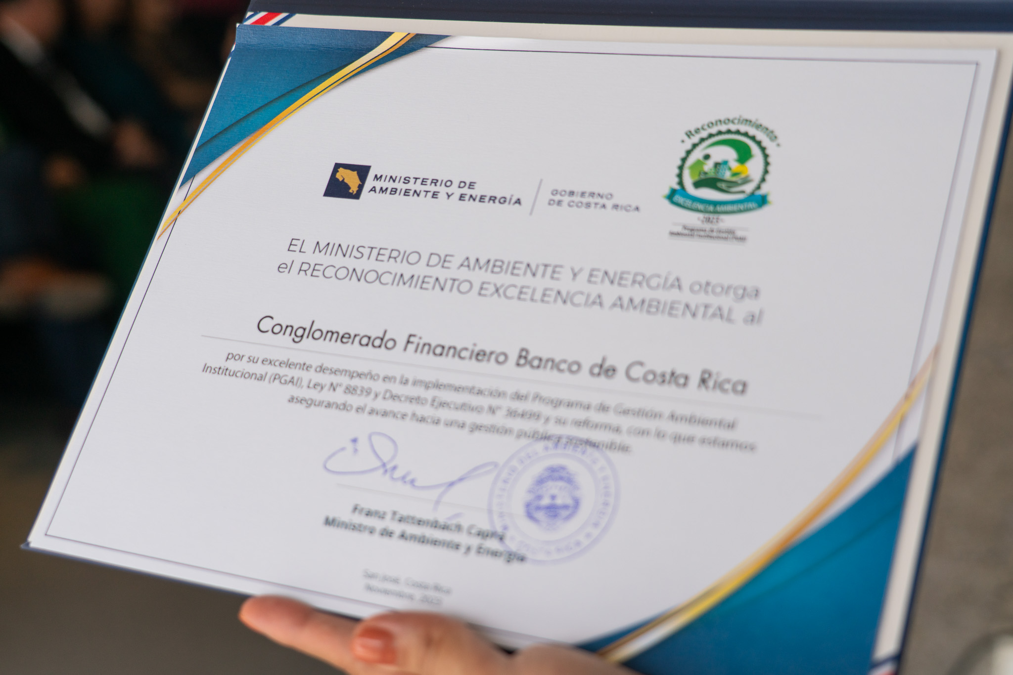 El Conglomerado Financiero Banco de Costa Rica, (CFBCR), recibió por séptimo año consecutivo, la calificación de excelencia en materia ambiental que otorga el Ministerio de Ambiente y Energía, (MINAE), a las instituciones públicas que hayan realizado una gestión sobresaliente en la implementación del Programa de Gestión Ambiental Institucional (PGAI).