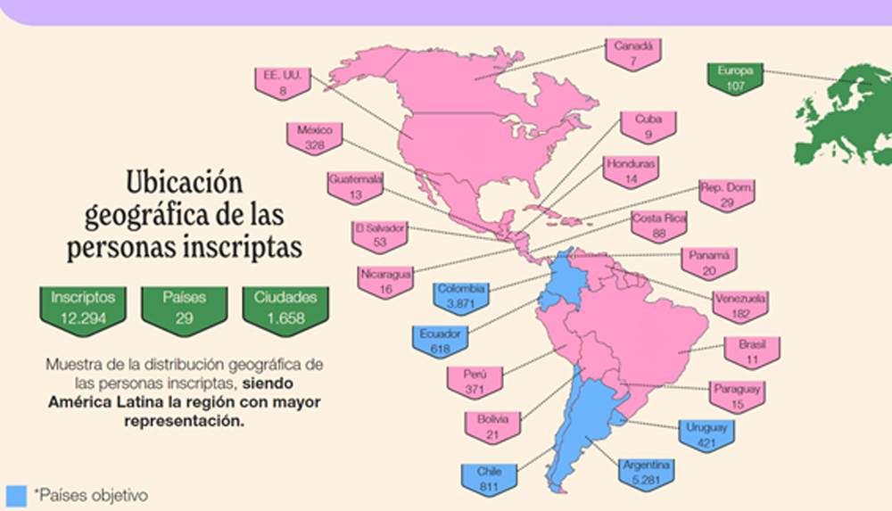 En 2024, los números mostraron un destacado interés para formarse y capacitarse de parte de toda la comunidad docente de América Latina y el Caribe: 5281 docentes participantes de Argentina, 3871 de Colombia, 811 de Chile, 618 de Ecuador, 421 de Uruguay, 371 de Perú, 328 de México, 182 de Venezuela, 88 de Costa Rica, 53 de El Salvador, 29 de República Dominicana, 21 de Bolivia, 20 de Panamá, 16 de Nicaragua, 15 de Paraguay, 14 de Honduras, 13 de Guatemala, 11 de Brasil, 9 de Cuba, 8 de Estados Unidos, entre otros. Participaron profesionales de la educación de zonas rurales, urbanas y periurbanas, quienes compartieron sus experiencias de transformación.
