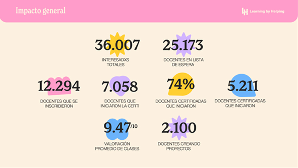 “El impacto de la Certificación nos llenó de entusiasmo, dado que muestra que no es una formación más, sino que realmente ha logrado impactar en las aulas y en las prácticas de enseñanza: el 74% de las personas que iniciaron el programa lograron certificarse. Además, durante la cursada, 2.056 docentes mostraron su compromiso con la causa desarrollando proyectos educativos enfocados en resolver junto a sus estudiantes problemáticas específicas de sus comunidades. Cada uno de estos proyectos es una contribución a los Objetivos de Desarrollo Sostenible (ODS). Estimamos que esta formación permitió impactar en más de 650.000 estudiantes por año de toda América Latina”, especificó Evelyn Abrahan, Directora de Marketing & Comunicación de Learning by Helping.
