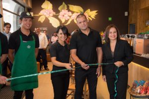 Cortaron la cinta de inauguración los «partners» de Starbucks Heredia y Mónica Bianchini, Country Manager Starbucks.
