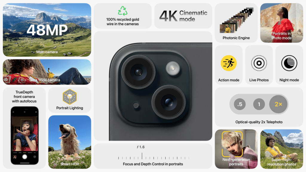Después de años con Lightning, el iPhone finalmente da el salto a USB-C impulsado por las exigencias regulatorias. Tiene  mejoras la batería, que ahora durará “todo el día” y en el sensor de la cámara. Durante mucho tiempo esta gama ha conservado un sensor principal de 12 MP, y ahora se actualiza con uno de 48 MP.