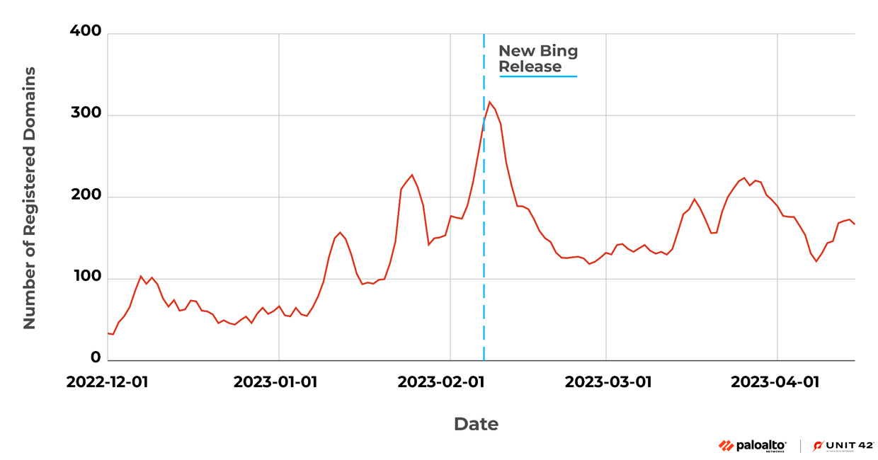 En marzo, OpenAI lanzó una nueva versión de su modelo de lenguaje natural, GPT-4. Y el gran problema de cualquier avance tecnológico masivo es que casi siempre existe el peligro de los ciberataques: cuantos más usuarios, mayor es la superficie de ataque. Para entender este movimiento, los investigadores de Unit 42, la unidad de Investigación e Inteligencia de Amenazas de Palo Alto Networks, están monitorizando los trending topics, los dominios recién registrados y los dominios ocupados relacionados con ChatGPT, ya que es una de las aplicaciones de consumo más populares y con mayor crecimiento de la historia, que también está atrayendo la atención de los estafadores.