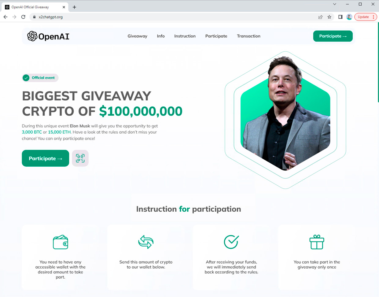 Los especialistas también han observado que algunos estafadores se aprovechan de la creciente popularidad de OpenAI para obtener criptomonedas. Se pudo identificar a un estafador que abusaba del logotipo de OpenAI y del nombre de Elon Musk para atraer a las víctimas a un evento fraudulento de distribución de criptodivisas.
