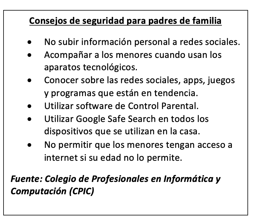“Hoy la tecnología nos permite a los padres y madres de familia ver en tiempo real lo que están haciendo nuestros hijos, gracias al software de control parental que permite conocer y monitorear lo que hacen, independiente del sistema operativo del dispositivo que utilicen, sea Windows, Android, IOS u otro. El software de control parental también nos permite limitar el contenido al que los niños y adolescentes pueden acceder en Internet desde sus dispositivos, ya sean teléfonos, computadoras o tabletas”, dijo Ing. Edgar Oviedo Blanco, vicepresidente de la Junta Directiva del Colegio de Profesionales en Informática y Computación (CPIC).