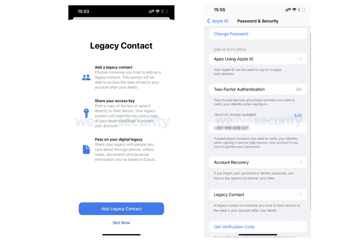 6. Apple: Introdujo en 2021 la posibilidad de elegir un Legacy Contact. Esta función solo está disponible para personas mayores de 13 años y tiene algunas limitaciones técnicas: se debe tener un ID de Apple activo en un dispositivo que ejecute al menos iOS 15.2, iPadOS 15.2 o macOS Monterey 12.1. El ID de Apple también debe tener habilitada la autenticación de doble factor.