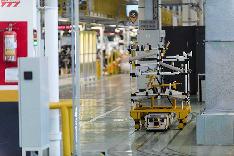 Vehículos de Guiado Automático (AGV). Son pequeños robots auto-guiados que impulsan carros de piezas y plataformas, lo que hace que la operación sea más segura y silenciosa. Este sistema también permite que la línea sea flexible para modificaciones y mejoras, ya que los AGV leen bandas magnéticas en el piso para desplazarse, cuya posición y extensión se modifican fácilmente. Nissan cuenta en América del Sur con más de 500 AGV en sus dos fábricas.