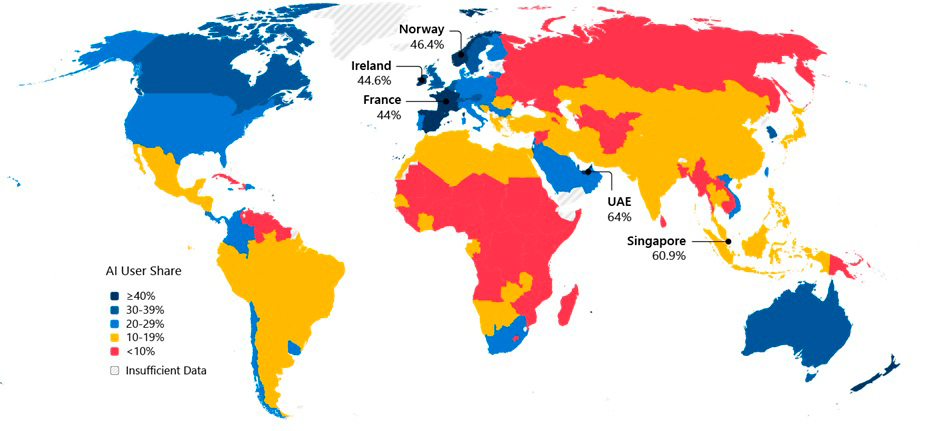 Países que han invertido pronto en infraestructura digital, habilidades en IA y adopción gubernamental, como Emiratos Árabes Unidos, Singapur, Noruega, Irlanda, Francia y España, continúan con su liderazgo. Los EAU ampliaron su ventaja como el país número uno, con un 64,0% de la población en edad laboral que utiliza IA a finales de 2025, frente al 59,4% a principios de año. Los EAU han abierto una ventaja de más de tres puntos porcentuales sobre Singapur, que sigue en segundo lugar con un 60,9% de adopción. La segunda mitad del año en Estados Unidos muestra que el liderazgo en innovación e infraestructuras, aunque fundamental, no conduce por sí solo a una adopción generalizada de la IA. Estados Unidos lidera tanto en infraestructura de IA como en desarrollo de modelos de frontera, pero cayó del puesto 23 al 24 en uso de IA entre la población en edad laboral, con una tasa de uso del 28,3 por ciento. Está muy por detrás de economías más pequeñas, más digitalizadas y centradas en la IA.