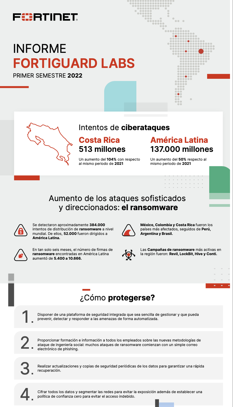 La región de América Latina y el Caribe sufrió 137.000 millones de intentos de ciberataques de enero a junio de este año, un aumento del 50% en comparación con el mismo período del año pasado (con 91.000 millones). Por su parte, Costa Rica sufrió 513 millones de intentos de intrusión, un aumento del 104% en comparación con el mismo periodo de 2021 (con 251 millones). México el país más atacado de la región (con 85.000 millones), seguido por Brasil (con 31.500 millones) y Colombia (con 6.300 millones).