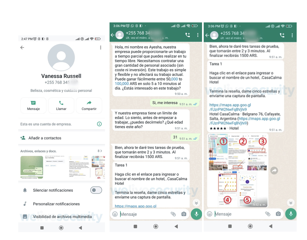 Todo comienza a través de un mensaje vía WhatsApp de un número desconocido con característica de Tanzania (+255), a nombre de Vanessa Russell, con un llamativo detalle debajo del nombre de perfil: “Belleza, cosmética y cuidado personal”. Lo que llama la atención es que la persona que entabla conversación con la posible víctima se presenta como Ayesha, diferenciándose del nombre que figura en el perfil. Luego de indicar que pertenece al Departamento de Recursos Humanos de Google Maps, pasa a desglosar el detalle del trabajo: modalidad, tiempo necesario y, por supuesto, la ganancia.