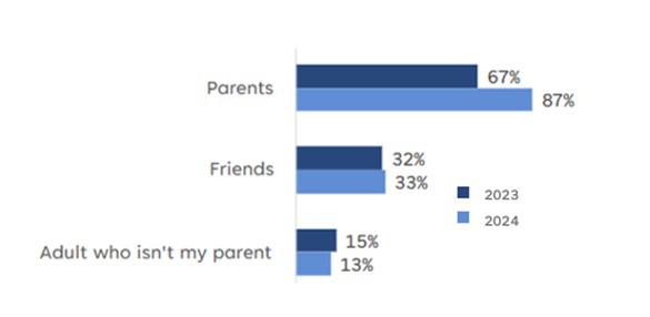En comparación con nuestra investigación de 2023, los resultados muestran un aumento de veinte puntos en el número de adolescentes que hablaron con sus padres sobre los riesgos en línea. De hecho, los jóvenes son más propensos a hablar con sus padres que con sus compañeros y amigos.