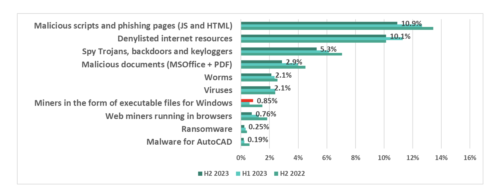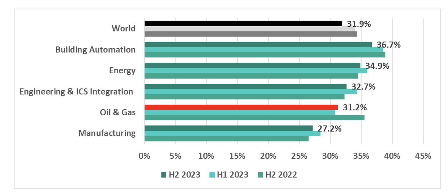 Centrándose en industrias específicas, el informe identifica la automatización de edificios como el sector más atacado (2º semestre de 2023: mayor porcentaje de objetos bloqueados). El sector del petróleo y el gas muestra una tendencia fluctuante, experimentando un ligero aumento de los ataques en el segundo semestre 2023 después de un período de declive.