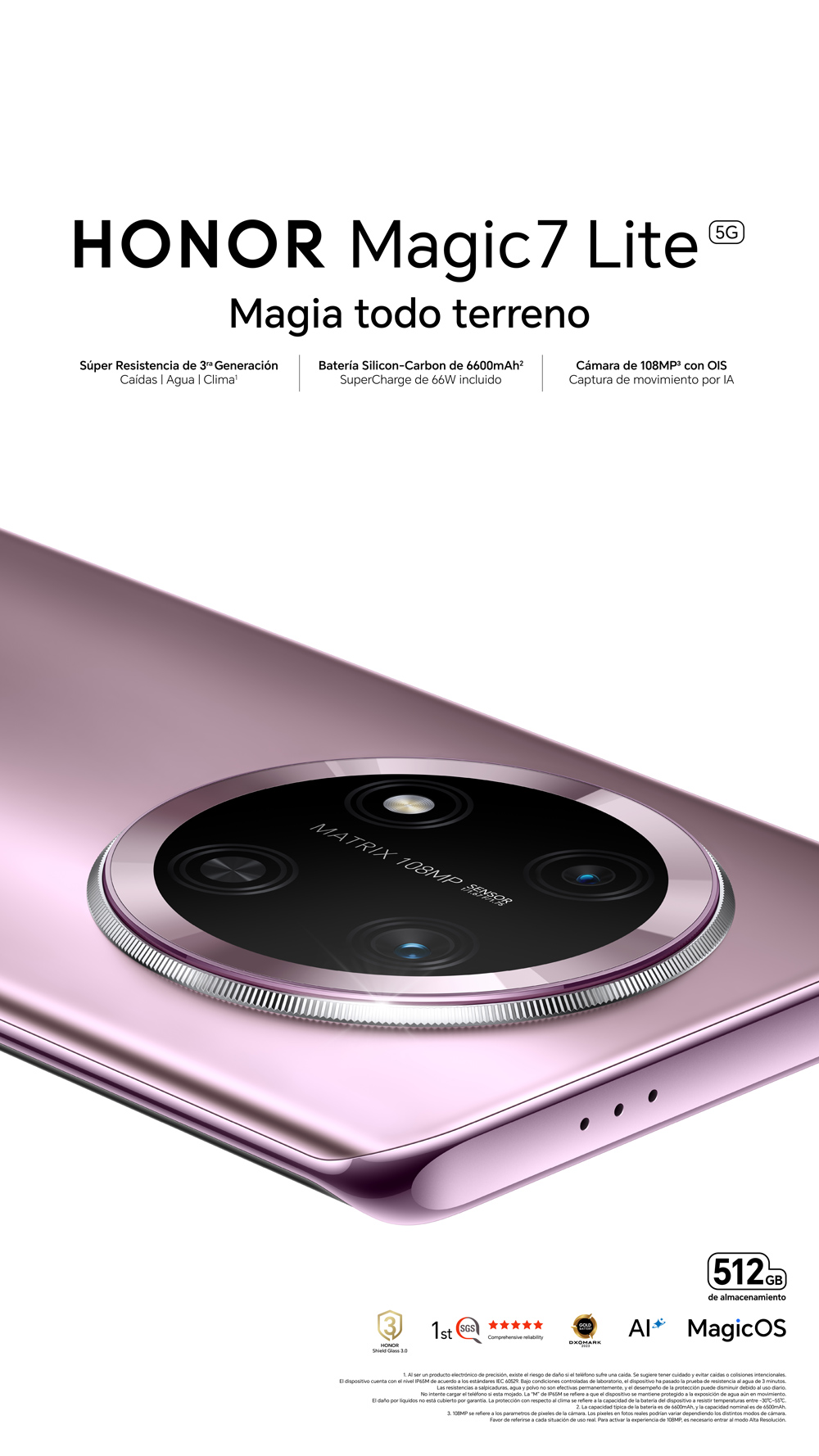 Con un peso de solo 189g y un grosor de 7.98mm, el HONOR Magic7 Lite combina funcionalidad y estética. Su acabado en titanio y colores disponibles —Morado Titanio, Negro Titanio y Jade Cyan— lo convierten en un dispositivo visualmente atractivo. Además, incluye el sistema operativo MagicOS 8.0 basado en Android 14, que ofrece funciones inteligentes como Magic Portal y Parallel Space para una experiencia personalizada. El HONOR Magic7 Lite está disponible en versiones de 256GB y 512GB. Cada dispositivo incluye accesorios como un cubo de carga rápida, cable cargador, cover protector y filmina preinstalada. Como valor agregado, HONOR ofrece una garantía 360° anti accidentes, que permite reemplazar sin costo la pantalla o la tapa trasera en caso de daños, dentro de los primeros seis meses tras la compra.