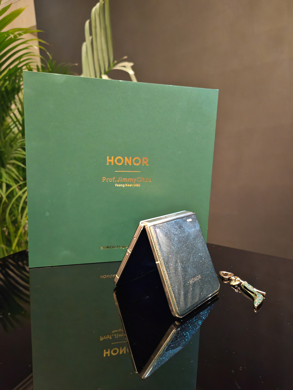 También presentamos el HONOR Magic V Flip Special Edition, una armoniosa fusión de moda y tecnología creada en colaboración con el célebre icono de la moda mundial Jimmy Choo. Esta exclusiva edición combina la elegancia de los cristales y el verde esmeralda, empleando técnicas de chapado de cristales a nivel micrométrico para recrear su fascinante brillo. Inspirándose en los relojes de gravedad, el dispositivo presenta a la perfección una pantalla sofisticada con una estética de alta costura, ofreciendo a los usuarios una experiencia realmente única.
