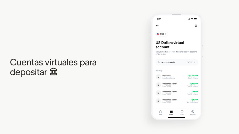- Cuentas virtuales: Impulsadas por Bridge, las cuentas virtuales en dólares estadounidenses están disponibles en 18 países, incluidos Estados Unidos, Japón, Singapur, Corea del Sur, Taiwán y toda América Latina. Los usuarios pueden recibir pagos de nómina directamente en World App y agregar fondos desde su banco a través de socios compatibles, lo que les permite gastar USDC sin comisiones dentro de la app.