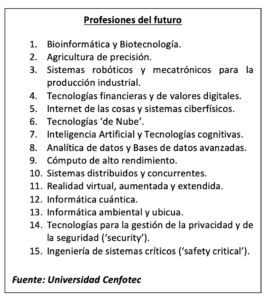 Las profesiones del futuro requieren incorporar a la tecnología. Las instituciones financieras, el sector agrícola, de salud, la industria y el comercio requieren cambios en sus procesos productivos. Todos los sectores requieren transformarse para ser más productivos y sostenibles. Se necesitan especialistas en Biotecnología, en Internet de las Cosas, Inteligencia Artificial, la Nube, Automatización, Robótica, Mecatrónica, Analítica de datos, entre otros, además de profesiones que se renuevan constantemente, como las de desarrollo de Software.