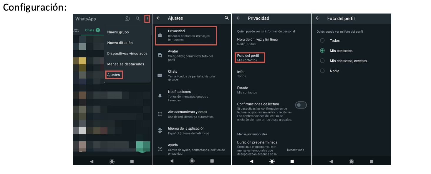 Por lo general, los delincuentes contactan a las personas agendadas por la víctima de suplantación de identidad y las engañan haciéndoles creer que cambiaron su número de teléfono, logrando la confianza para cometer estafas con un perfil falso. Usando la foto real, le dan verosimilitud a la historia. Por eso, cuanto más restrictiva sea la visualización de la foto, más segura será. Desde ESET recomiendan que la configuración se realice para la opción “Mis contactos”, así solo las personas agendadas podrán ver la foto, o “Mis contactos, excepto” que restringe aún más la visualización y permite una lista de personas que se tiene agendada pero tal vez no sean tan cercanas.