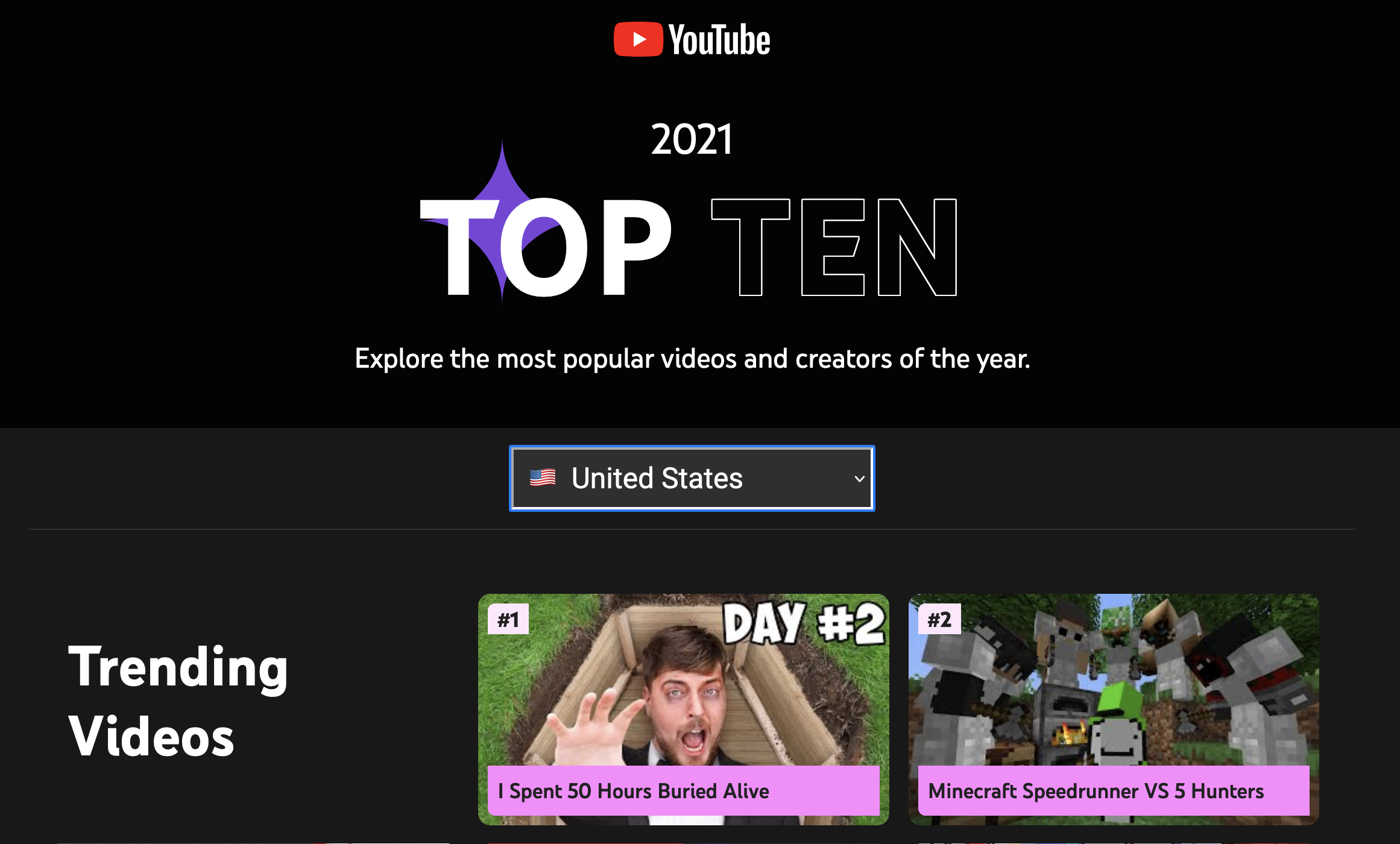 Además, este 1 de diciembre a las 12 pm, se lanzó un micrositio con las listas Top 10 de distintos países en youtube.com/trends, de esta forma la comunidad podrá explorar y ver los videos populares, videos musicales, creadores, creadores revelación y los creadores de Shorts 2021. La experiencia tendrá un diseño visual como la aplicación y el reproductor de video inspirado en Shorts con el Top 10 de las listas de México, Argentina, Estados Unidos, Australia, Canadá, Alemania, Francia, Reino Unido, India, Japón, Corea del Sur, Oriente Medio y África del Norte, entre otros.