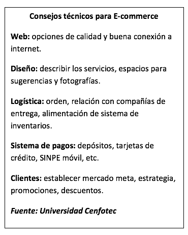 “Se deben establecer preguntas clave y dar respuestas a las mismas según nuestra idea de negocio, como  ¿Qué voy a vender? ¿Es un servicio o producto?, establecer una estrategia de venta, comercialización y almacenamiento, ¿Mi producto o servicio es de elaboración propia o necesito proveedores? ¿Qué tipo de medios de pago voy a aceptar? ¿Hosting?”, explicó José Alberto Vega Chacón, profesor de Universidad Cenfotec.