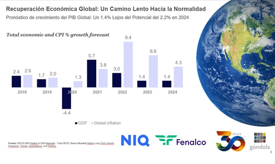 El análisis de NIQ indica también que la recuperación económica seguirá un camino lento hasta alcanzar la normalidad y señala que de acuerdo con la OCDE el pronóstico de crecimiento del PIB Global es de 1,4%, resultado lejano del potencial 2,2% que se había indicado para 2024.