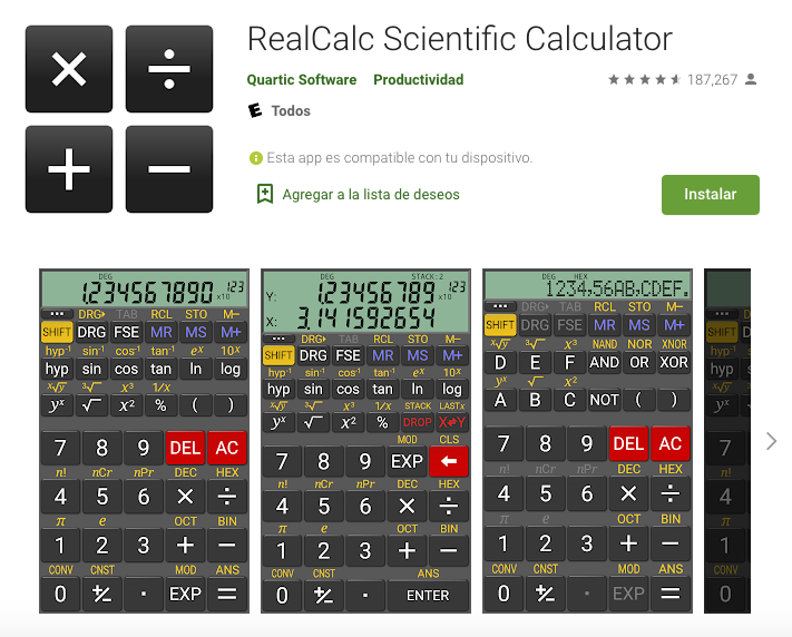 Esta app ha sido diseñada para verse y funcionar exactamente igual que una calculadora de mano real y usted puede elegir entre una serie de estilos y formatos de visualización.