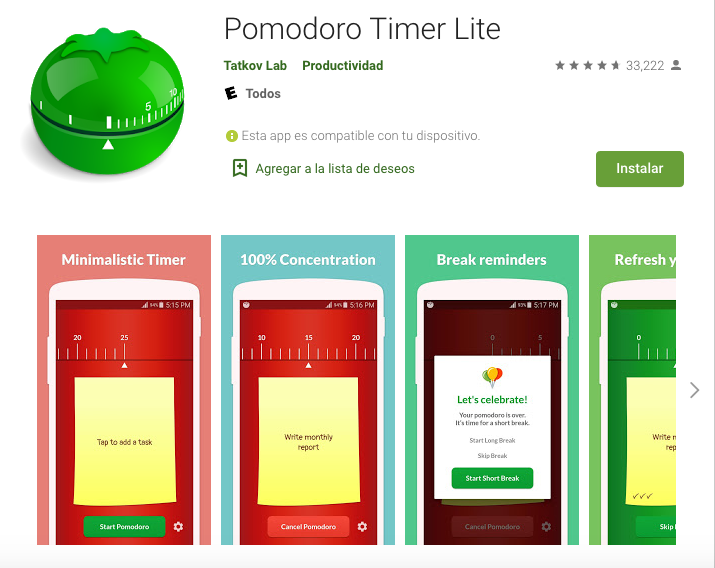 Para utilizarla el primero paso será elegir la tarea que desea realizar. Luego establecerá un temporizador de 25 minutos y empezará a trabajar. Cuando la aplicación se lo notifique será el momento de descansar entre 3 y 5 minutos. Uno de cada cuatro descansos debe ser mayor, de 15 a 25 minutos.