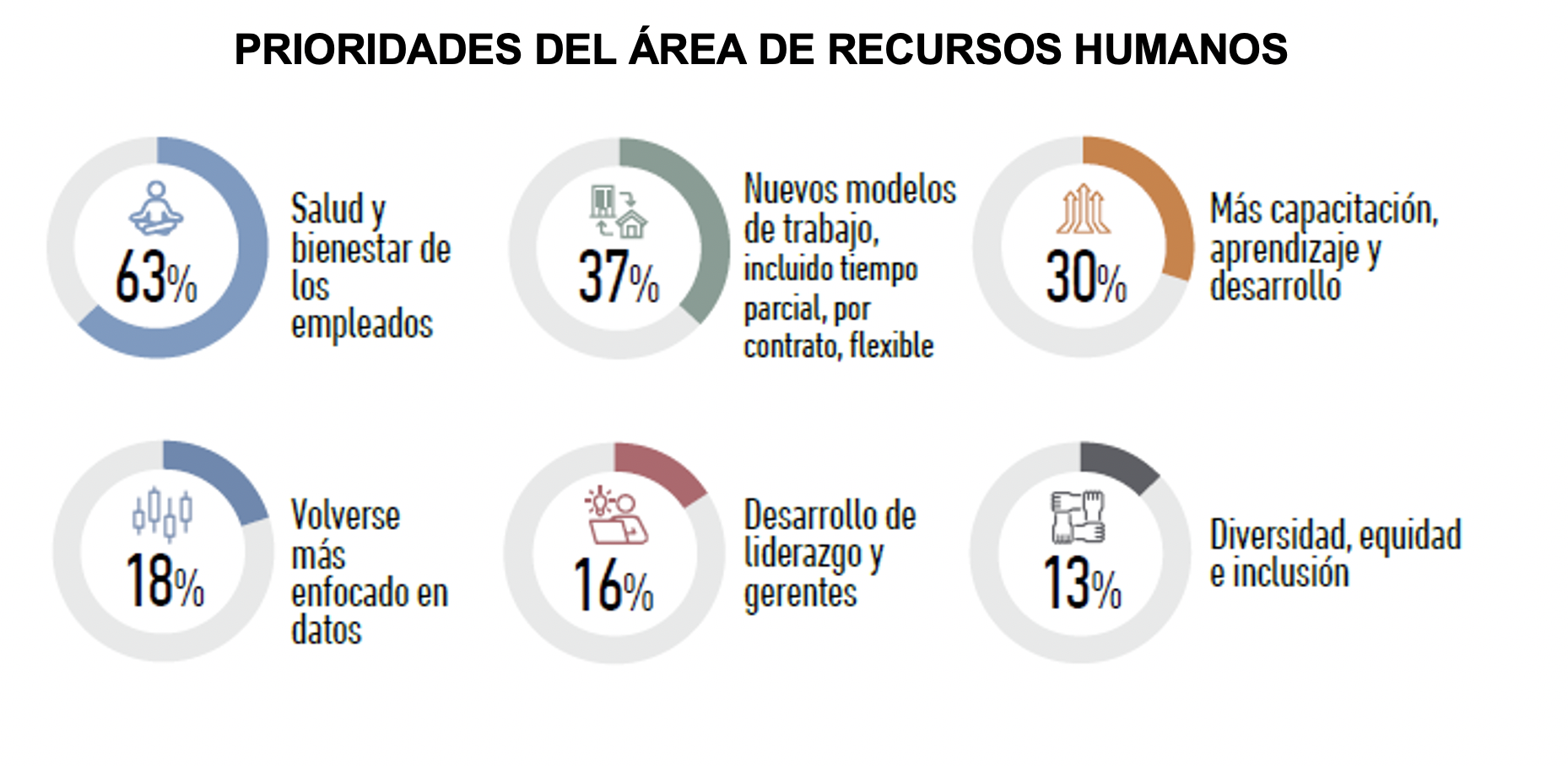 Además de la digitalización de los procesos, a partir del 2021 y en adelante, el 63% de los líderes de recursos humanos ven la salud y el bienestar de los empleados como la prioridad más importante, el doble de importante que la siguiente prioridad de crear nuevos modelos de trabajo e impulsar un mayor enfoque en la mejora de las habilidades, el aprendizaje y el desarrollo.