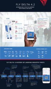 Delta difundió la más reciente versión de su aplicación móvil Fly Delta, dando a los clientes acceso a los mapas más innovadores del sector en lo referente a ubicación en los aeropuertos, así como la capacidad de mantener la tarjeta de embarque o los detalles del vuelo incluso cuando no haya disponible una red Wi-Fi de fiar o una red de telefonía móvil.