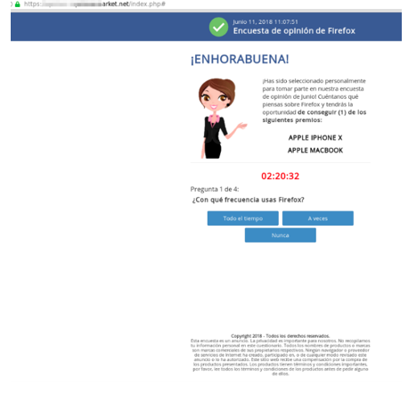 En algunos sitios, con solo ingresar el navegador se redirige automáticamente a dos campañas de ingeniería social. La primera consiste en una supuesta encuesta para conocer la opinión del usuario acerca del navegador que está utilizando.