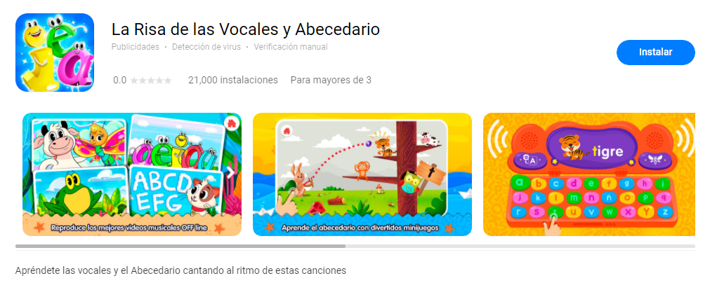La risa de las vocales y abecedario: Esta aplicación enseña de manera interactiva las letras del abecedario, vocales y también por medio de juegos relaciona cada letra con palabras que poseen esa letra. La aplicación se divide en secciones: una de videos para aprender mientras cantan, una sección con teclado para escuchar el sonido de cada letra y la palabra relacionada, y una categoría de trazo de letras para habilidades motoras.