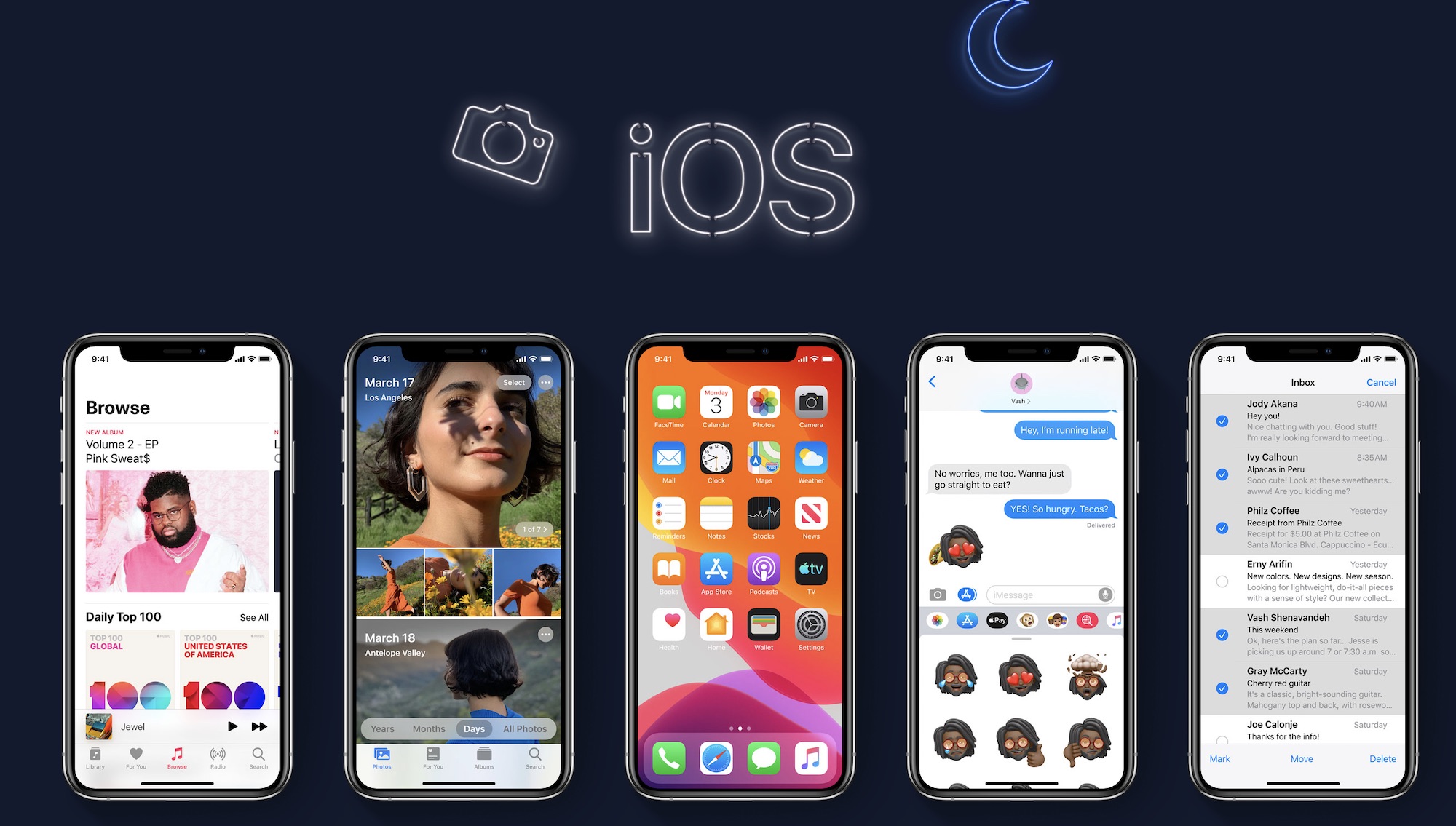 En cuanto al sistema operativo usado el los iPhone, iOS13 cambia ligeramente de aspecto pero, sobre todo, incorpora mejoras en el rendimiento: Face ID será un 30% más rápido, y las apps ocuparán un 50% menos. «Las apps se abrirán en la mitad de tiempo», aseguró la empresa.
