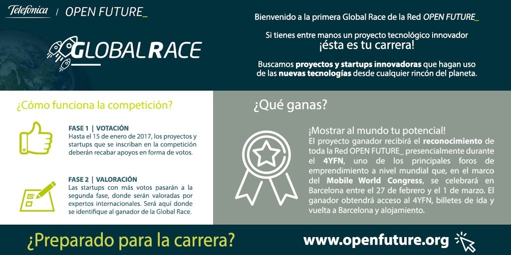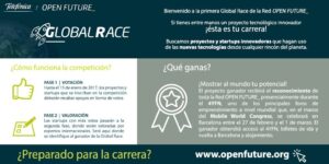 La TOF_ Global Race está dirigida a proyectos que estén dando sus primeros pasos: que no tengan ingresos y con menos de 1000 usuarios, y la forma de inscribirse es muy sencilla: hay que dar de alta a esta propuesta en www.openfuture.org/es/info/globalrace y recabar el mayor apoyo posible en forma de votos antes del 15 de enero. Aquellas propuestas que más votos consigan serán las que formen parte de la selección final, entre las que expertos internacionales de la Red Open Future_ elegirán la ganadora antes del 31 de enero.
