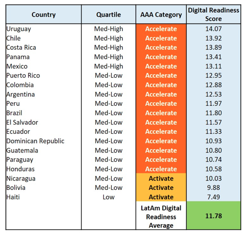 Según el estudio, el promedio de Latinoamérica fue de 11.78. El promedio global de preparación digital es de 11.96. Las puntuaciones globales de preparación digital para los países en la etapa más alta (Amplificar) promediaron 16.83. Aquellos en la etapa intermedia de preparación digital (Acelerar) promediaron 12.49, y aquellos en la etapa más baja de preparación digital (Activar) promediaron 7.91.