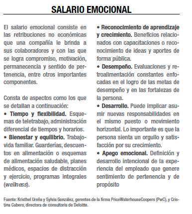 Para alcanzar esa satisfacción, las empresas deben proporcionar las mejores condiciones, como un salario acorde a los atestados del trabajador y lo que hace en la empresa, flexibilidad de horario, capacitación constante y oportunidades de crecimiento, así como un ambiente laboral sano. Si bien hay factores que motivan, lo ideal es que la la compañía conozca a su personal para luego entablar una estrategia de motivación sabiendo lo que puede ofrecer, así opinan Kristhel Ureña y Sylvia González, gerentes de la firma PriceWaterhouseCoopers (PwC).