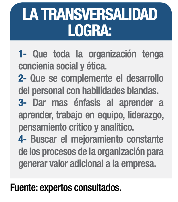 A ello se le conoce como transversalidad, un instrumento que ayuda a que todos los departamentos tengan esa conciencia social y ética, complementado con el desarrollo de habilidades blandas como el trabajo en equipo, liderazgo, comunicación oral y escrita, pensamiento crítico, entre otros, a fin de mejorar los procesos de la organización y generar valor.