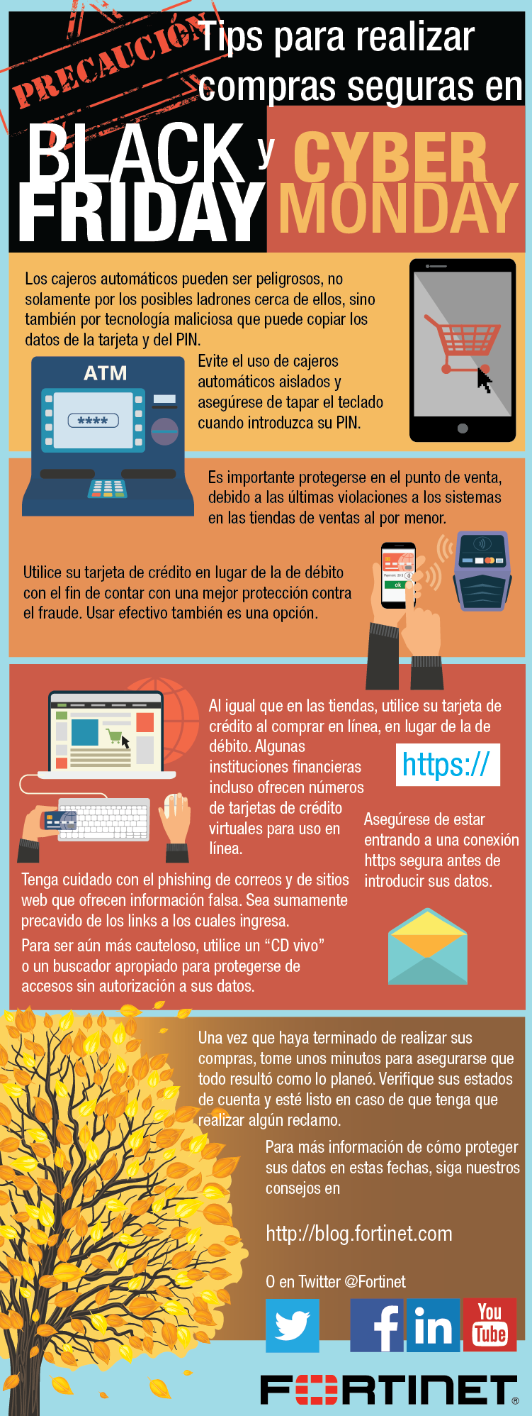 “Este año, se espera que los consumidores gasten más durante estas fechas que el año pasado, previendo que más de la mitad de este crecimiento provenga del uso de los smartphones por parte de los consumidores,” afirmó Richard Henderson, estratega de seguridad de FortiGuard Labs. “Los clientes deben estar atentos a posibles amenazas que afecten su información personal y financiera, ya sea en línea, en sus teléfonos o en las tiendas. Es importante que sepan las medidas que deben tomar con el fin de evitar ser impactados.”