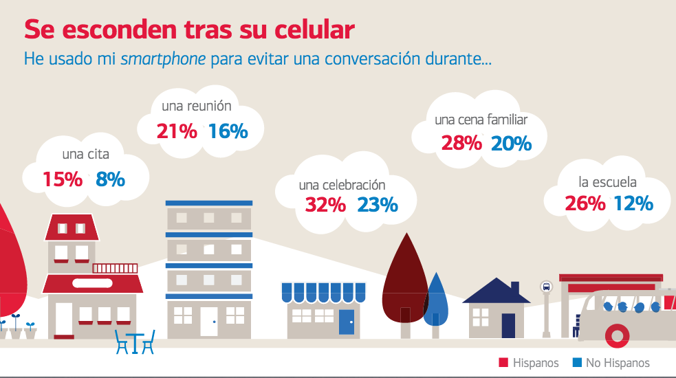 Esta mentalidad de «estar siempre conectados» también está presente en las comunicaciones cotidianas, ya que los encuestados hispanos (35 %) afirman que son más propensos a interactuar con su smartphone en un día normal, más que con cualquier persona u otros medios, incluyendo a sus parejas (29 %). Los hispanos son más propensos que los no hispanos a tener más de un dispositivo móvil (64 por ciento), y afirman (32 %) que el mensaje de texto es su método de comunicación preferido.