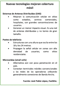 En la actualidad, la tecnología DAS y los postes de telefonía son las soluciones que mejor complementan a las torres celulares. En menor medida, emerge la opción de las microceldas, aunque, en un mediano plazo, se espera que se incremente su presencia en el mercado.