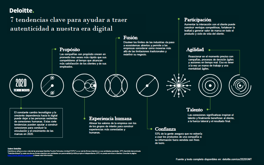 Mediante su Reporte “Global Marketing Trends”, (Tendencias Globales de Mercadeo), Deloitte identificó siete tendencias en las que las empresas debería centrar su atención en los próximos 18 a 24 meses para llegar a ser una empresa con conciencia social y humana.