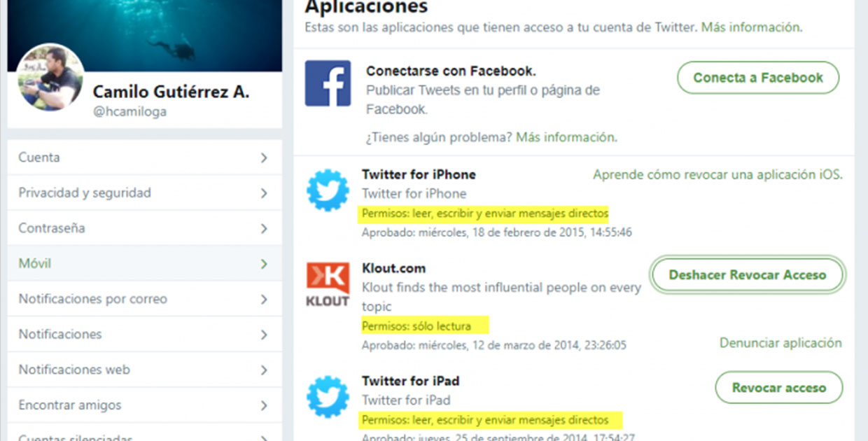 Con Twitter ocurre algo muy similar, ya que en la parte de configuración de la cuenta es posible acceder a la información de las aplicaciones que tienen acceso a la información.