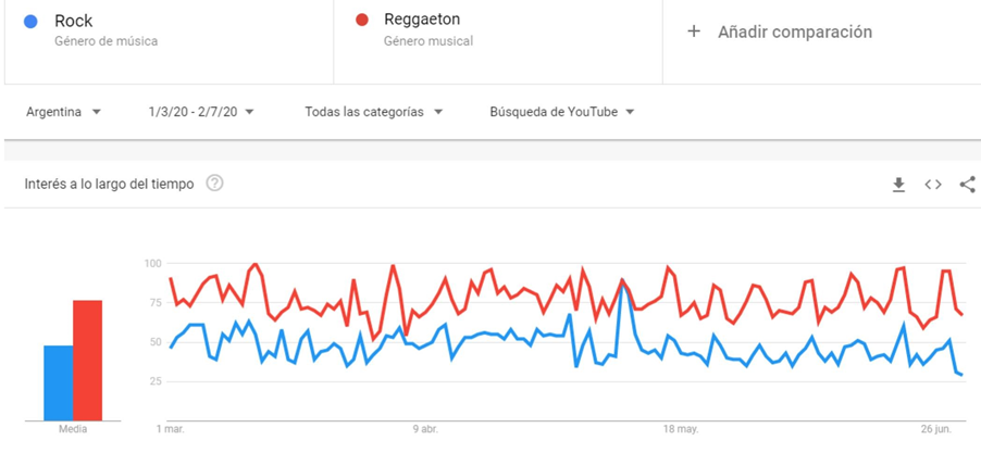 En América Latina, el género “reggaeton” es indiscutidamente el más popular, superando fronteras y llegando incluso a posicionarse entre los primeros puestos del Ranking global de canciones más escuchadas en YouTube durante 2019. Desde inicios de marzo hasta el día de hoy, la búsqueda del rock en Panamá, Costa Rica y Guatemala se ha mantenido con picos fluctuantes pero persistentes, mostrando que el interés en este género musical no decae.