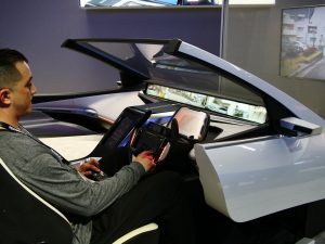 Estilo de entretenimiento: un espacio de cabina alegre y vibrante creado por música, imágenes, iluminación y aromas emocionantes. En CES2018, «Smart Design Cockpit» y «Smart Vision Cockpit» se exhibe en el Área de soluciones, y «Living Space Autonomous Cabin» en el área de visión.