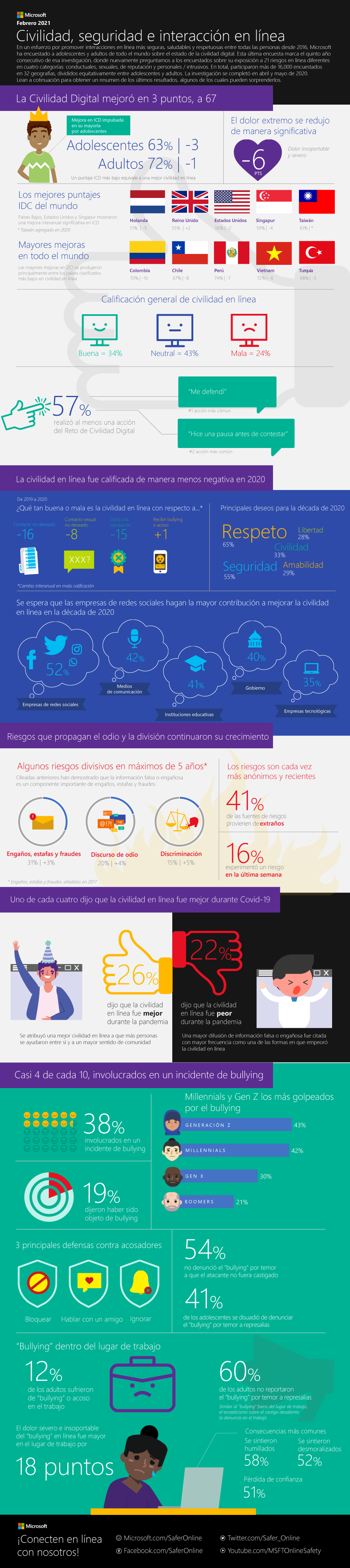 El índice de civilidad digital (ICD) de Microsoft revela que la exposición a los riesgos en línea se redujo tres puntos porcentuales a nivel global, es decir, alcanzó un 67% contra el 70% del año pasado. La encuesta formuló preguntas como «¿Qué riesgos en línea han experimentado usted y su círculo cercano, ¿cuándo y con qué frecuencia han ocurrido los riesgos, qué consecuencias tuvieron y qué acciones se tomaron?» – y midió la exposición de los encuestados a 21 riesgos en línea en cuatro áreas: conductual, reputacional, sexual y personal/intrusivo, siendo los 5 riesgos principales: