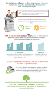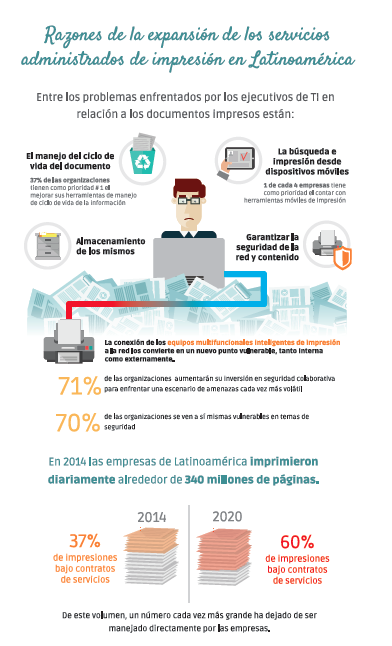 Un reciente informe de International Data Corporation (IDC) reveló las principales razones que llevan a las empresas a contratar los servicios administrados de impresión (MPS, por sus siglas en inglés). Para las compañías estos ofrecen una reducción en los costos totales de operaciones de impresión, un mayor control y transparencia de la estructura de costos, mejores niveles de servicios, así como la gestión centralizada de los dispositivos de impresión, servicios de mantenimiento, tinta y toner. Adicionalmente buscan la mejoría de la seguridad física y lógica del entorno de impresión, la reducción del impacto ambiental generado por la impresión física de los documentos y la optimización del flujo de documentos dentro de las organizaciones.