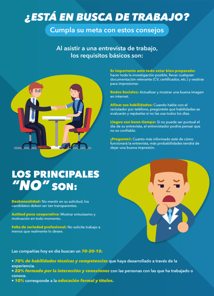 “La entrevista de trabajo sigue siendo el método de mayor importancia a la hora de una contratación, de esta manera, se evalúan las capacidades técnicas y habilidades del aplicante, así como su personalidad y presentación. Hoy en día en las compañías se habla de la búsqueda de un 70-20-10. Un 70% de habilidades técnicas y competencias que haya desarrollado a través de la experiencia y que pueda demostrar, un 20% formado por la interacción y conexiones con las personas con las que ha trabajado o conoce y 10% corresponde a la educación formal y títulos” concluye Campos.