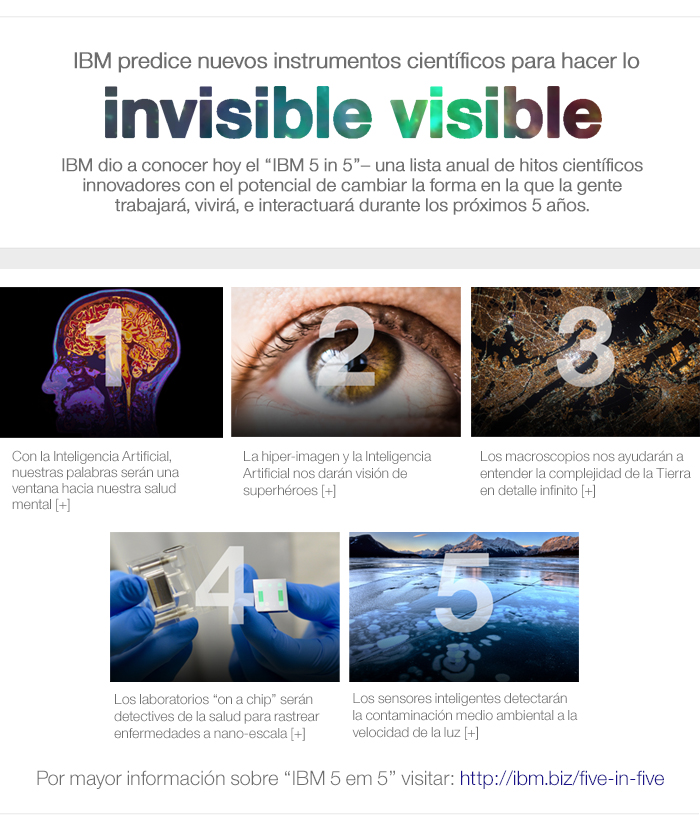 Las predicciones 5 en 5 de IBM (IBM 5 in 5) están basadas en tendencias de mercado y sociales, así como en tecnologías emergentes de los laboratorios de IBM Research en todo el mundo, que pueden hacer posibles estas transformaciones. Aquí están los 5 instrumentos científicos que harán lo invisible visible en los próximos 5 años: