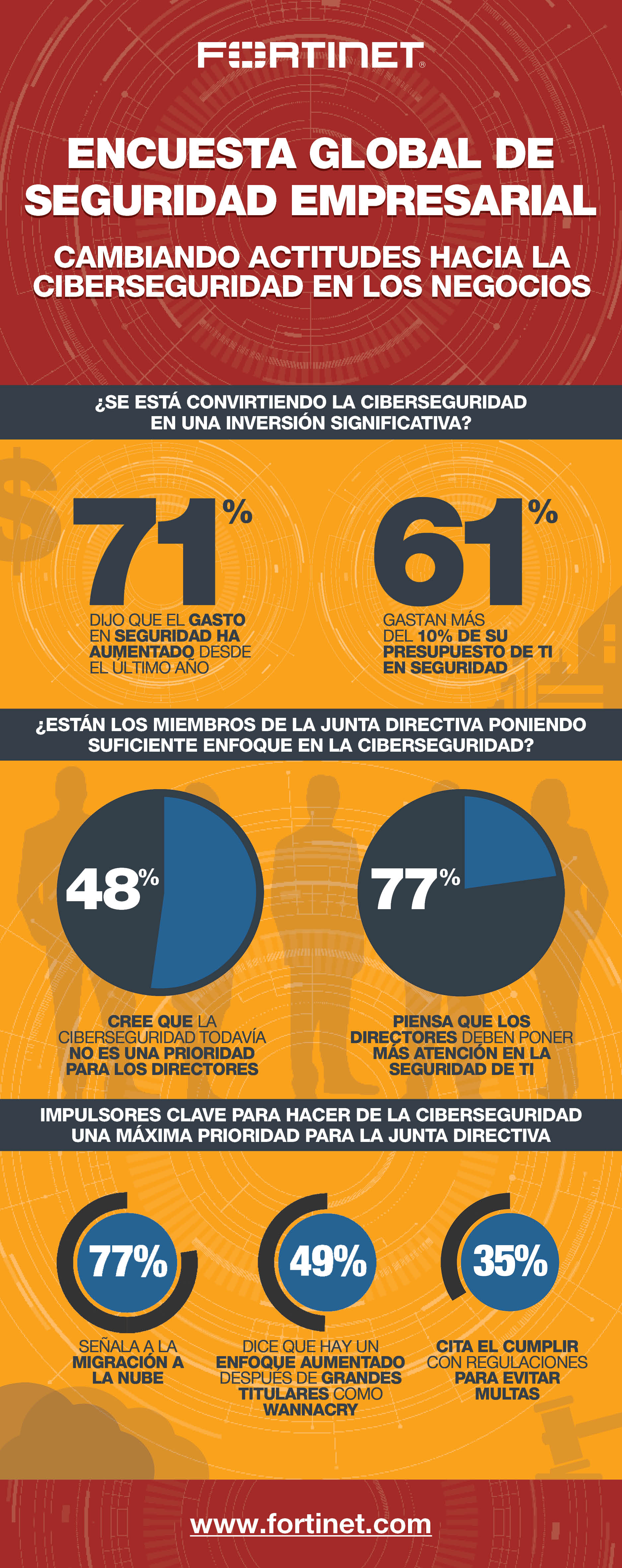 Este tema se enfatiza en nuestra Encuesta Global de Seguridad Empresarial. Al encuestar a más de 1.800 tomadores de decisiones en tecnología informática, Fortinet encontró que aproximadamente la mitad de los encuestados cree que la seguridad todavía no es una discusión de máxima prioridad para la junta directiva. Al mismo tiempo, sostienen fuertemente que la ciberseguridad debe convertirse en una prioridad de la alta dirección, con el 77% de los encuestados indicando que la junta tiene que poner la seguridad de TI bajo un mayor escrutinio.