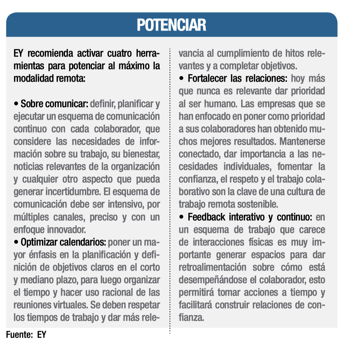 Si bien las empresas carecen de la necesidad de crear un cargo de “jefe de trabajo remoto” o “jefe de trabajo en casa”, los líderes sí han debido contar con más herramientas para garantizar la coordinación, el desarrollo y la continuidad de las tareas de su equipo a distancia.