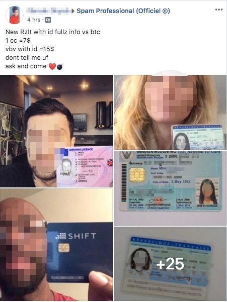 Muchas de las actividades en estas páginas son totalmente ilegales. Por ejemplo, descubrimos varias publicaciones en las que los usuarios vendían números de tarjetas de crédito y los CVV que los acompañaban, a veces con documentos de identificación o fotos pertenecientes a las víctimas.
