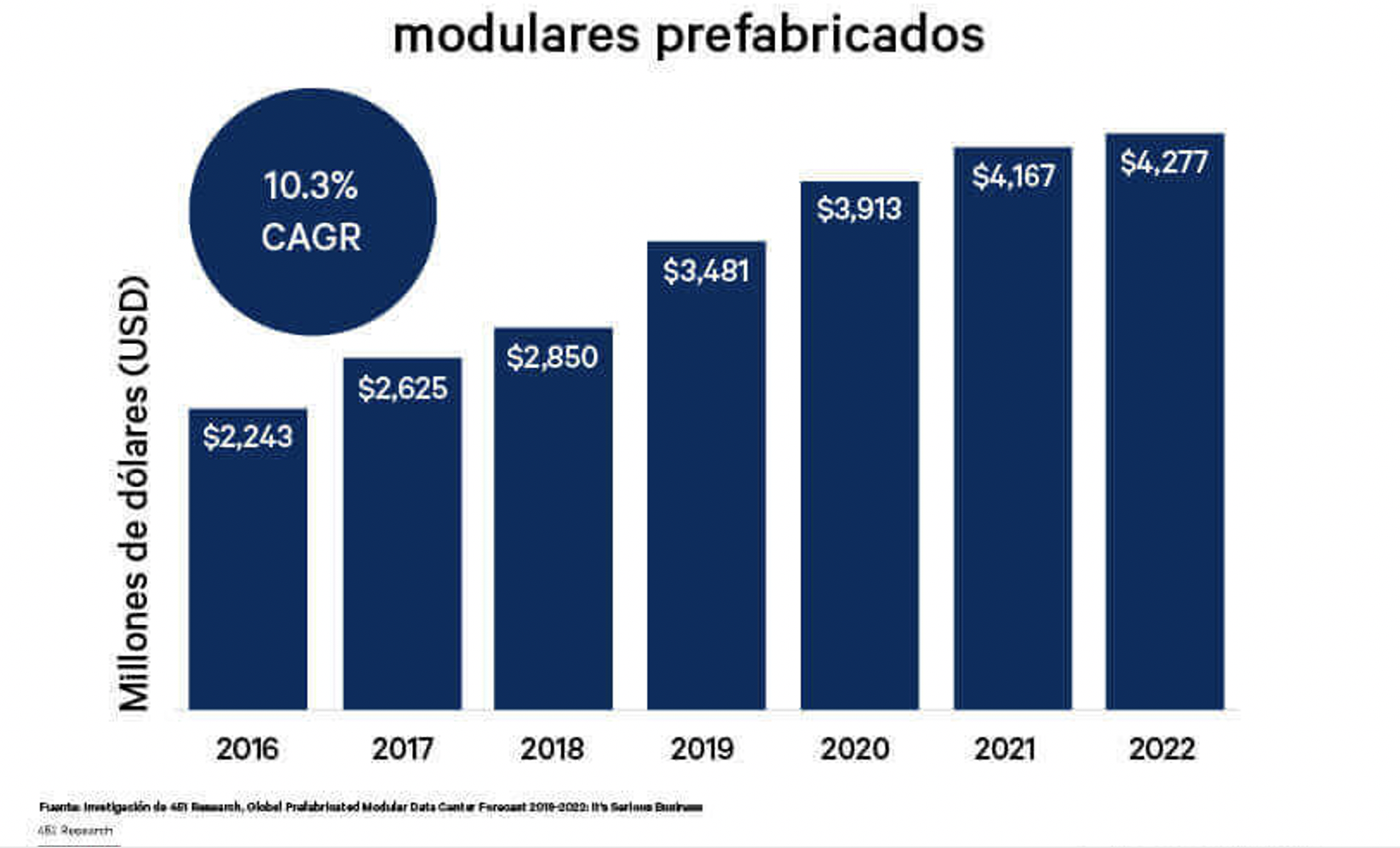 A medida que los centros de datos modulares pasan a primer plano, estos están siendo utilizados por empresas de todos los tamaños. Para 2022, el mercado global de centros de datos prefabricados alcanzará un valor de US$4200 millones, más que los US$2600 alcanzados en 2017, de acuerdo con 451 Research, una compañía de investigación tecnológica.