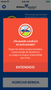 Esta herramienta le permite a las personas conocer cuál es el impacto que podría tener su consumo de alcohol en el organismo. Con solo ingresar 3 datos (género, edad y tipo de bebida), la aplicación le indica a los usuarios el porcentaje promedio de alcohol en la sangre y cuál es la afectación que podrían tener para coordinar, movilizarse o comunicarse. Además muestra la hora en la que inicia el consumo y el tiempo estimado de recuperación.